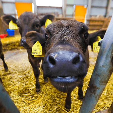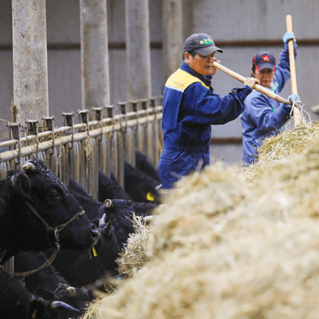 70頭ほどの黒毛和種を飼育し、ブランド牛として育てられていく仔牛を肥育農家へ出荷しています。生まれてから3ヶ月は親牛の乳を飲み、その後10ヶ月まで当牧場で大切に育てて、肥育農家等に販売しています。